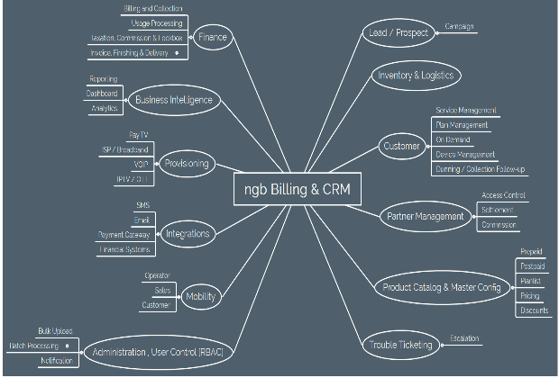 Managing subscriber life cycles,integrating payment gateways,CRM and comprehensively dealing with One Time Charge,Metering& Charging, Recurring Charges,Credit / Debit Notes,Collections & Online Payments and Reversal,Deposit and Refunds,Complex Account Structure and GL Mapping,Reseller / Partner Account Management and several aspects of billing is NGBS forte in supporting entities and businesses efficiently overcome subscription billing related hassles and constrains.